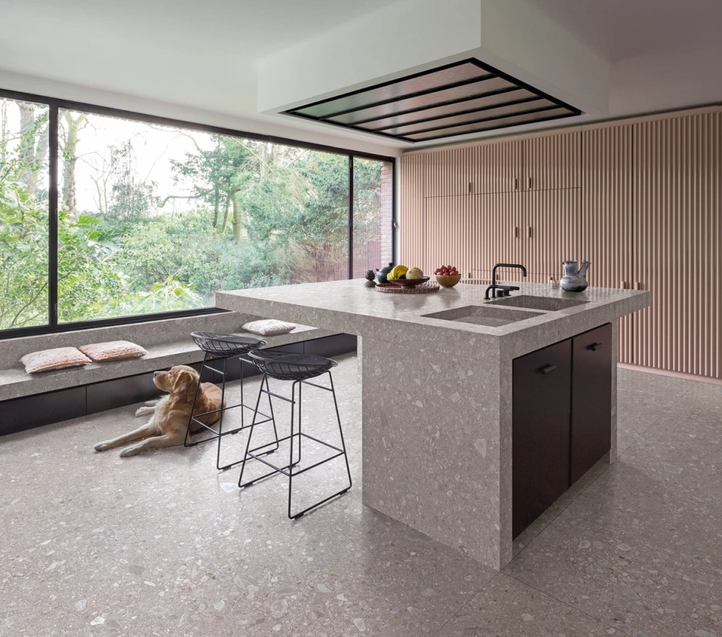 Große Formate gehören zu den großen gestalterischen Vorteilen. Cosentino und Laminam nennen große Slab-Formate, die eine nahezu fugenarme Planung erlauben. Gerade bei Inselküchen oder langen Zeilen ist das ein enormer Mehrwert.
