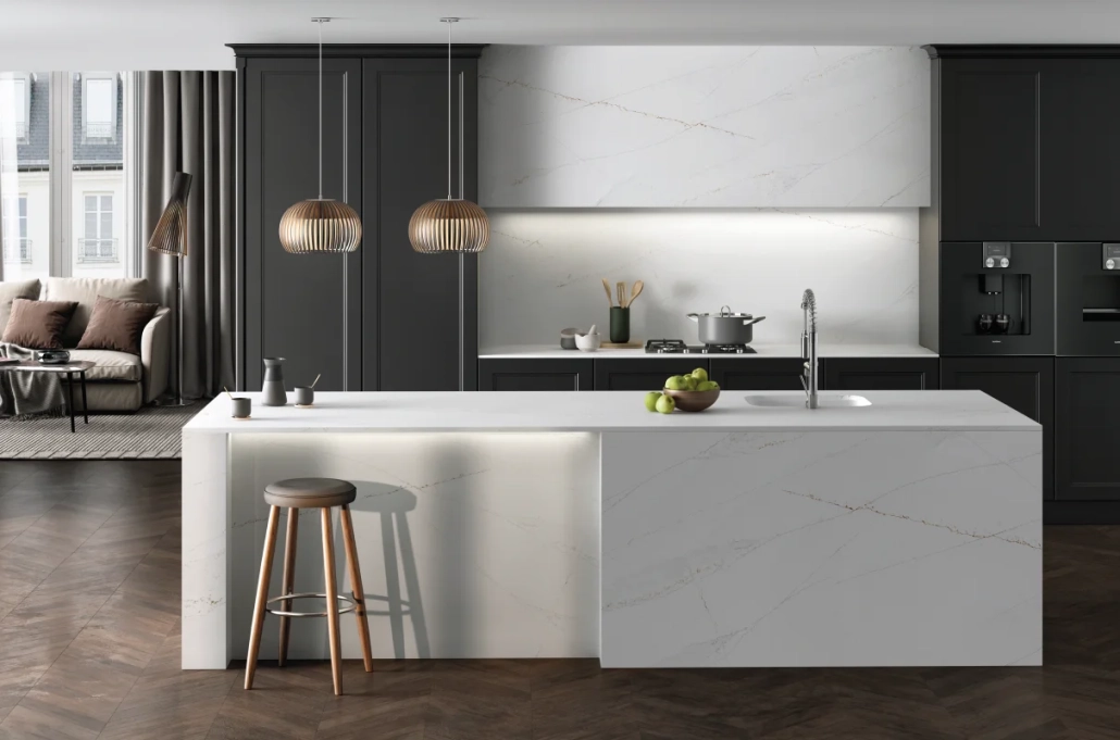 Eine Quarzkomposit-Arbeitsplatte kann großartig mit Rückwänden harmonieren – entweder Ton in Ton oder bewusst kontrastierend. Gerade im Premiumsegment entscheidet diese Abstimmung stark über die Gesamtwirkung.